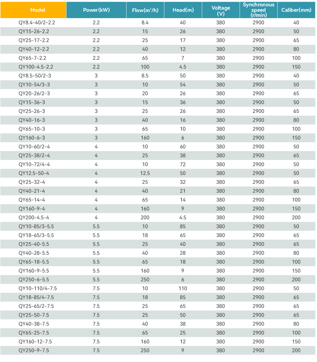 QY series oil-immersed submerged electric pump (hereinafter referred to as the electric pump). The electric pump consists of three parts:pump, seal, and motor. The pump is located at the top of the electric pump and has a centrifugal or axial flow structure. The motor is located at the bottom of the electric pump and is an oil-filled threephase asynchronous motor. A built-in integral mechanical seal box is used between the pump and the motor. An "O" shaped oil-resistant rubber sealing ring is used for static sealing at each fixed stopper sealing point.